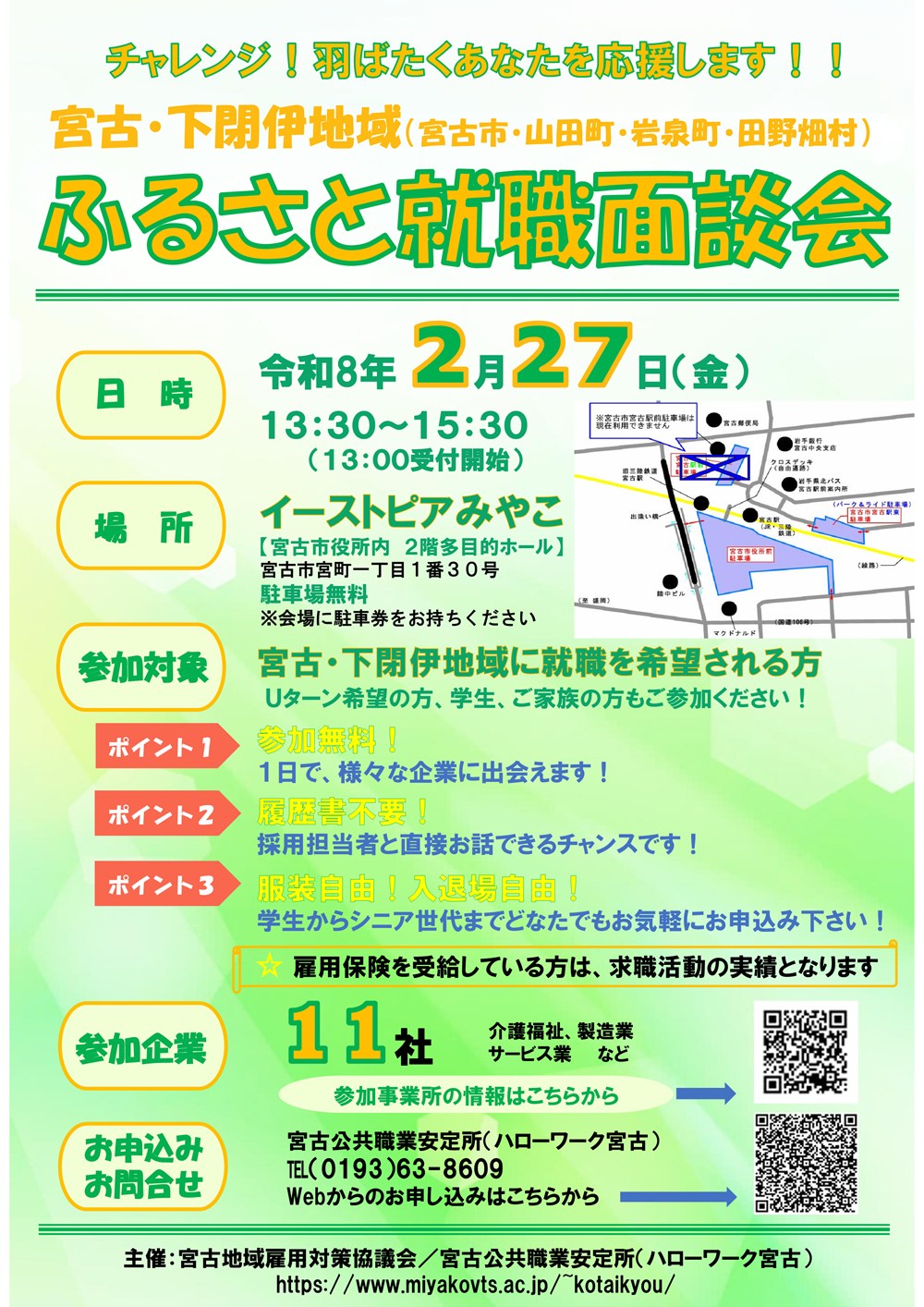 宮古地域雇用対策協議会では、宮古・下閉伊地域に就職を希望する若者からシニア世代までの方を対象に宮古・下閉伊地域ふるさと就職面談会を開催します。