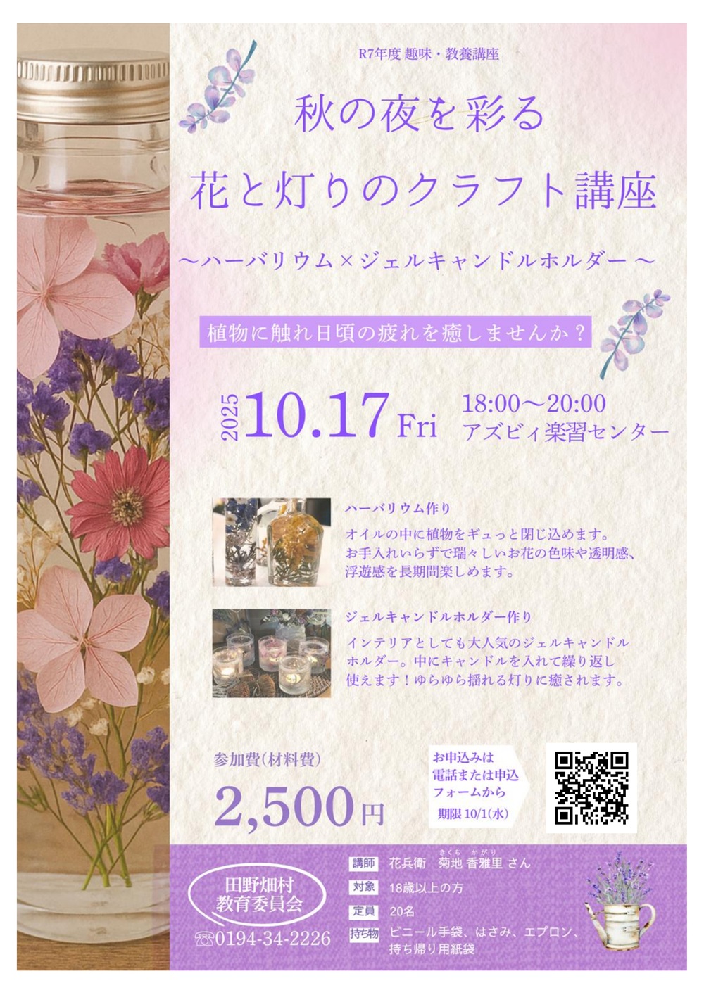 教育委員会では、「秋の夜を彩る花と灯りのクラフト講座」を開催します。