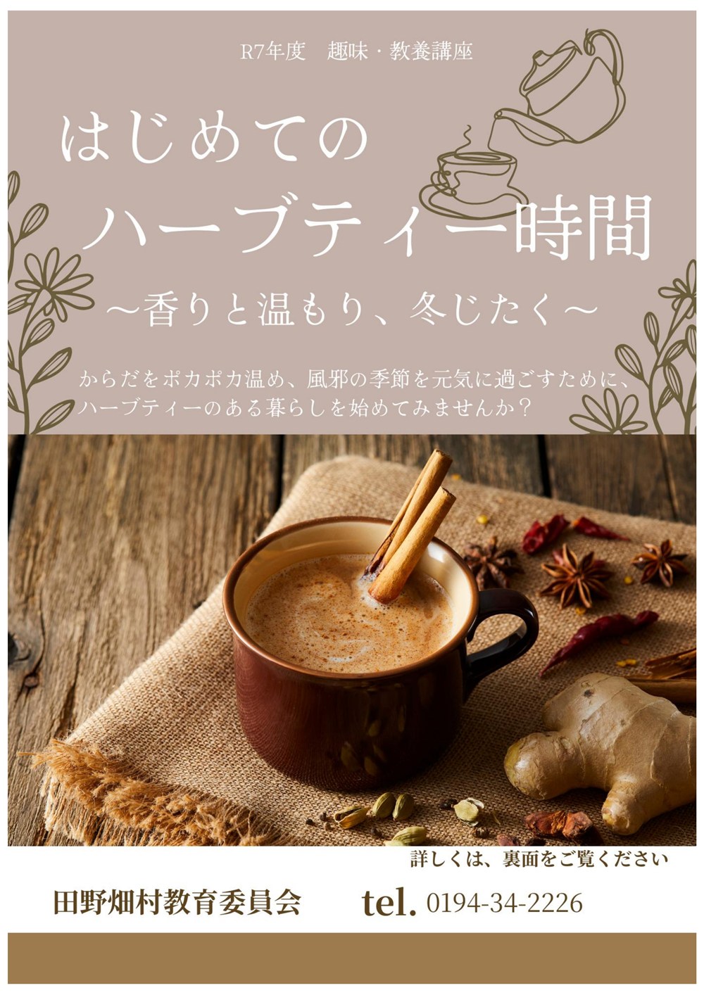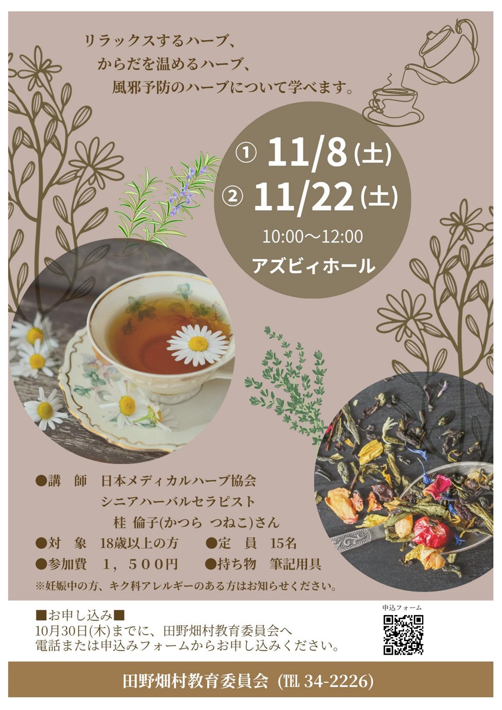 教育委員会では、「はじめてのハーブティー時間~香りと温もり、冬じたく~」を開催します。